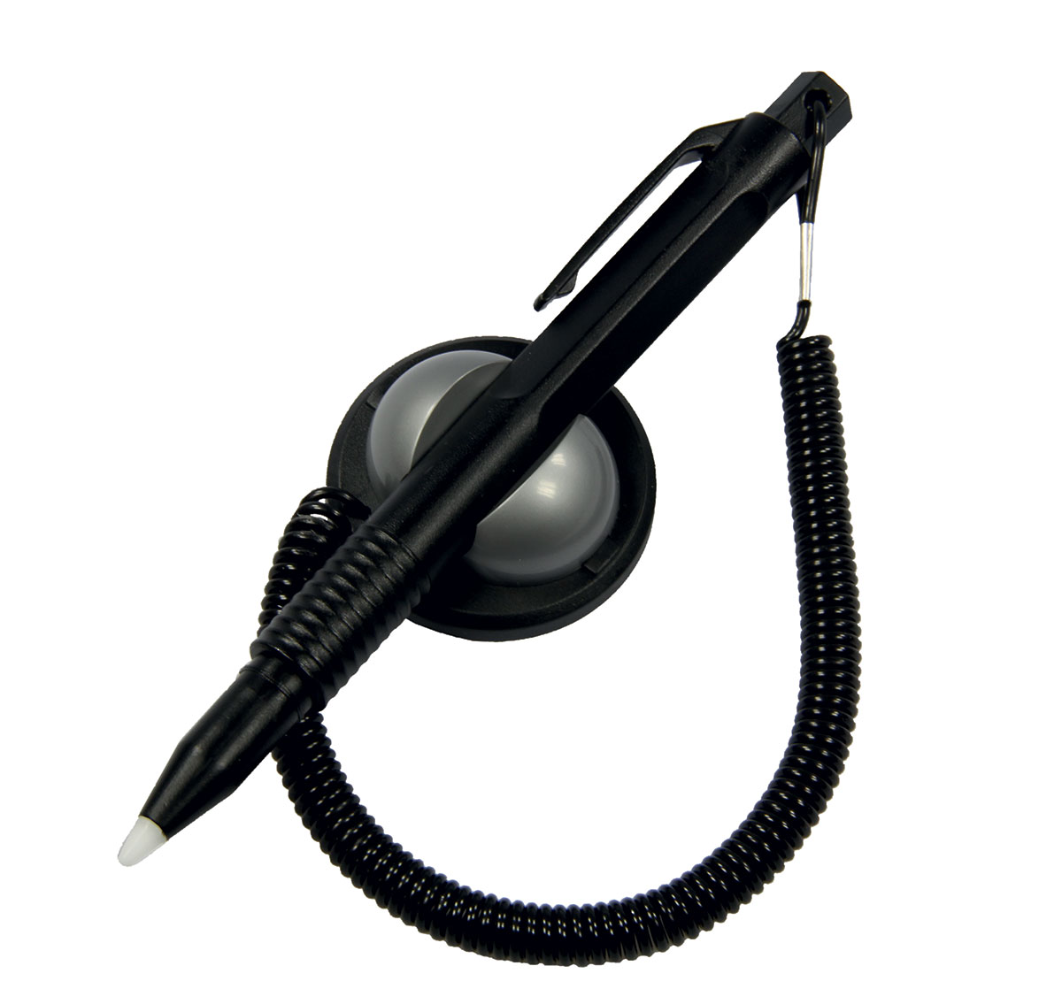 Solider massiver Touchstift für resistive Touchscreens mit Spiralschnur und Klick-Befestigung.